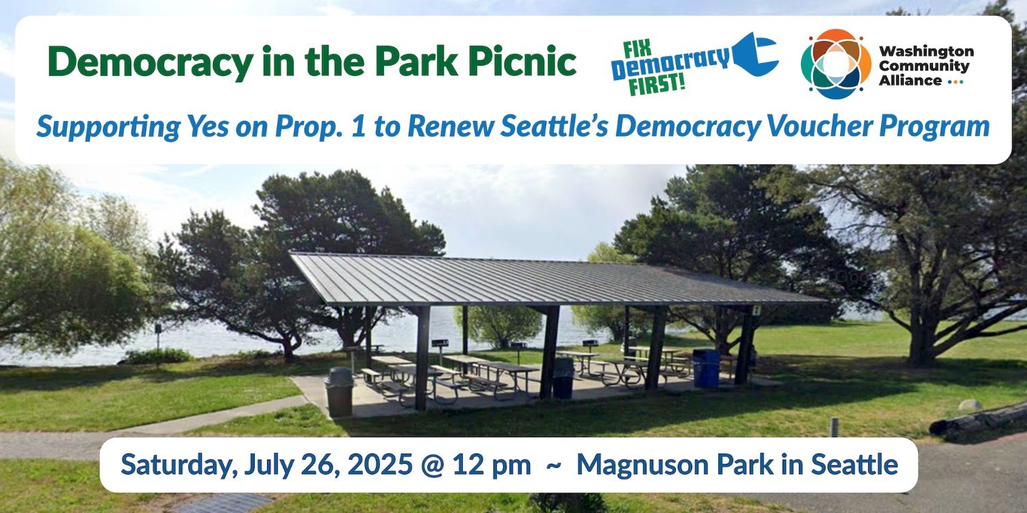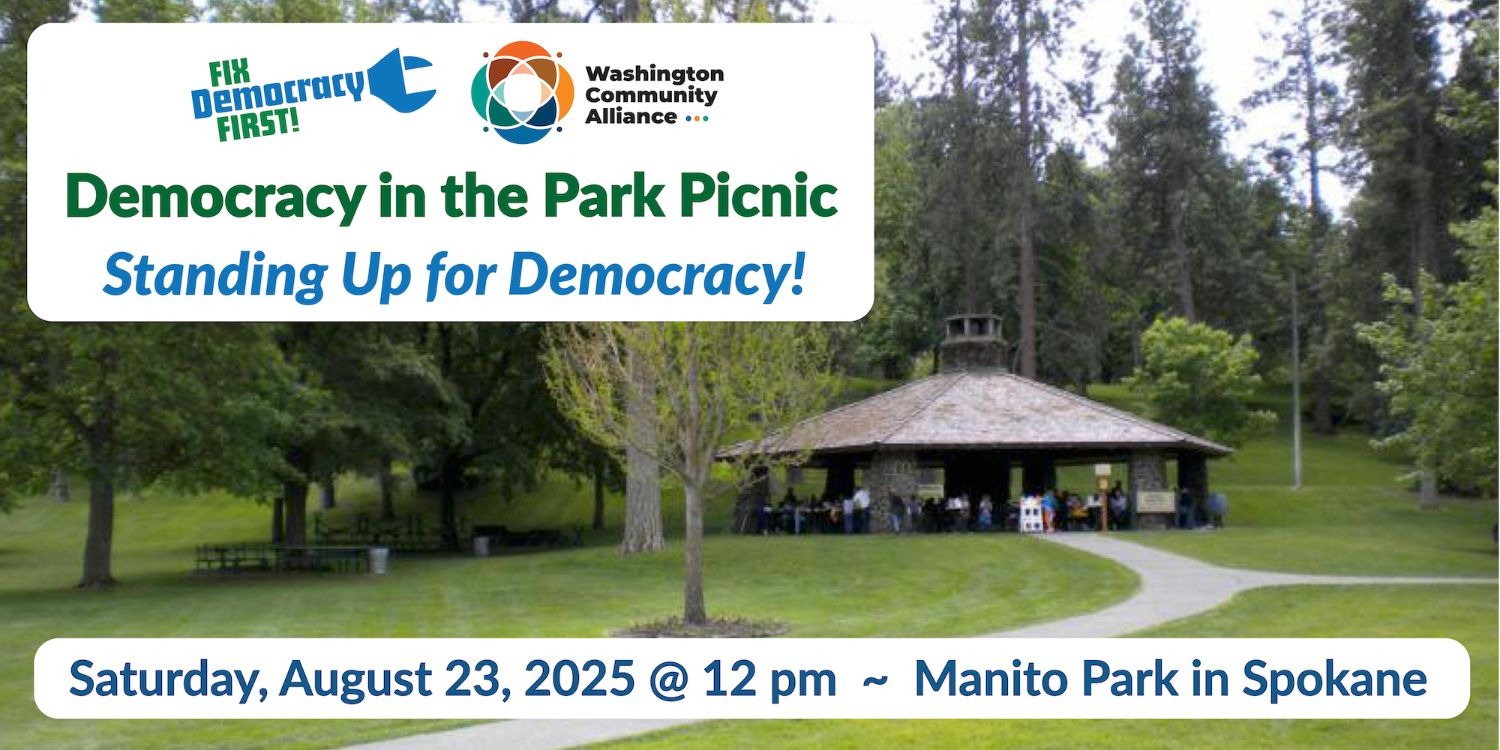 Democracy in the Park Picnics! Join Fix Democracy First & Washington Community Alliance for Democracy in the Park Picnics with lots of great food, drinks, fun activities, energizing conversations and more, in Seattle on Saturday, July 26th & Spokane on Saturday, Aug 23rd! The Seattle picnic will also be a GOTV event for the Seattle Democracy Voucher Program renewal, Yes on Prop 1 Seattle, that will be on the Aug 5th primary ballot! The cost is FREE for both events! Suggested donations and sponsorships are welcome. More details below. ~~~~~~~~~~~~~~~~~~~~~~~~~~~~~~~~~~~~~~~~~~~~~~~ When: Saturday, July 26, 2025 @ 12-6 pm - Come for part or all the event! Where: Magnuson Park - Picnic Shelter #1 7400 Sand Point Way NE, Seattle, WA 98115 ~~~~~~~~~~~~~~~~~~~~~~~~~~~~~~~~~~~~~~~~~~~~~~ When: Saturday, August 23, 2025 @ 12-3 pm - Come for part or all the event! Where: Manito Park - North Picnic Shelter (Lower) 1702 S Grand Blvd, Spokane, WA 99203 |