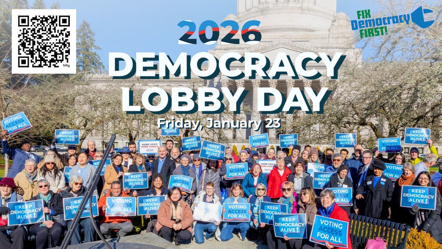 | Let's engage our legislators in Olympia, WA to support voting rights lobbying event of the year — Democracy Lobby Day 2026 on Friday, January 23rd at The United Churches of Olympia. What: Democracy Lobby Day 2026 Where: United Churches of Olympia Engage with policy experts on the 2026 Voter Power Package, rally with elected leaders on the Capitol Steps, and attend meetings with your State Legislators. Additionally, special sessions throughout the day will be held on the current state of voting and election policies in Washington State. Bills we are prioritizing for Democracy Lobby Day 2026: -