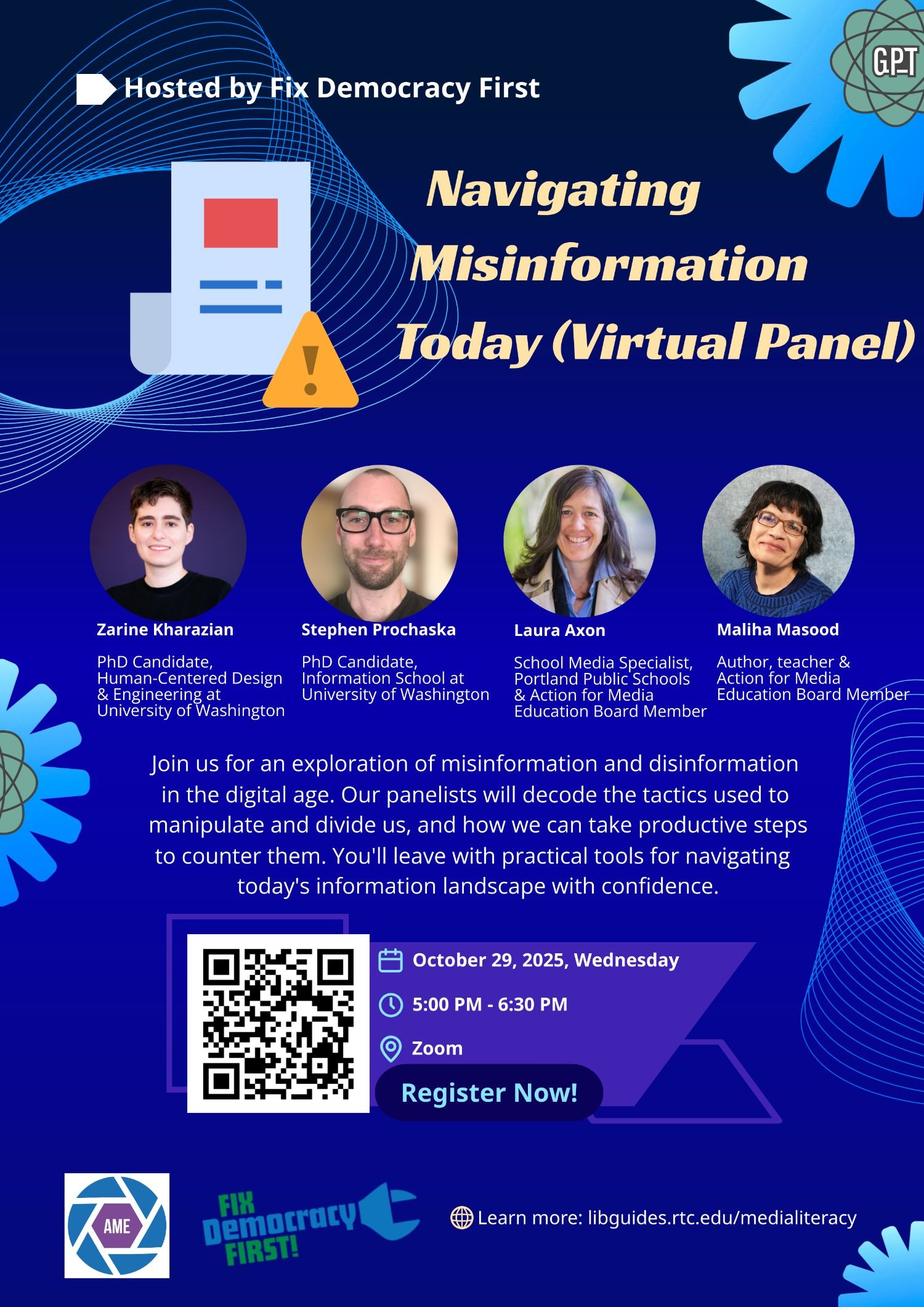 Democracy Happy Hour TODAY @ 5 pm PT/8 pm ET via Zoom! Grab a drink and come hear about the latest democracy news, ongoing efforts to fix democracy, and actions you can take at our weekly Democracy Happy Hour, Wednesdays @ 5 pm PT/8 pm ET. This is an online virtual event via Zoom. Today's topic for October 29, 2025: SPECIAL EVENT for Media Literacy Week: Navigating Misinformation Today Panel Discussion Join us for an exploration of misinformation and disinformation in the digital age. Our panelists will decode the tactics used to manipulate and divide us, and how we can take productive steps to counter them. You'll leave with practical tools for navigating today's information landscape with confidence. Panelists include: Laura Axon Zarine Kharazian Maliha Masood Stephen Prochaska with moderator Di Zhang |